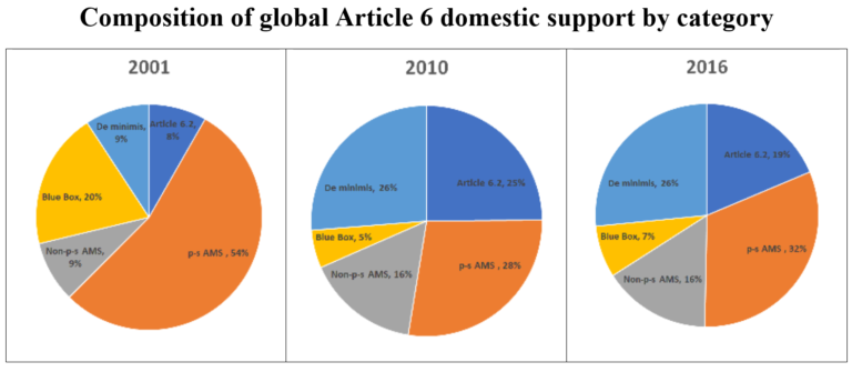 China and India provide large amounts of TDS in absolute terms partly because they are large countries with large agricultural sectors. If instead TDS is expressed as a proportion of a country’s value of agricultural output, the rankings look very different with small countries with a strong comparative disadvantage in agricultural production at the top of the league: Iceland with a share in 2016 of 72%, Norway with 52%, Switzerland with 13%, Japan with 12%, and Israel and Canada with 8% each. The figures for the US are 8% and for the EU 5%. For China and India, on the other hand, the figures are 3% and 10%, respectively, in 2016 (again, these proportions combine Article 6 and de minimis support in the Canadian tool to calculate TDS).