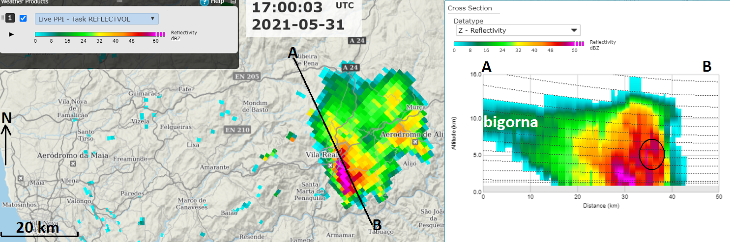 O radar de Arouca/Pico do Gralheiro (A/PG) permitiu efetuar a monitorização detalhada de múltiplas células convectivas geradoras de granizo e saraiva, de que se apresenta um exemplo ocorrido próximo de Vila Real (Fig 1). Na imagem de corte vertical das 17:00 UTC (18:00, hora local) o radar permitiu identificar valores de refletividade (Z) acima de 58 dBZ a grande altitude (cerca de 5000 m), sendo inclusive observável refletividade que se destaca a 15000 m de altitude, claramente acima do nível geral dos topos observados. Estes factos demonstram a presença de correntes ascendentes muito vigorosas. É também visível (Fig 2) que na região do núcleo convectivo, em imagem de corte vertical, os hidrometeoros foram classificados como granizo e graupel (esta última classe correspondente, na presente classificação de hidrometeoros, a graupel propriamente dito mas também a granizo de pequeno diâmetro). Estas observações refletem a presença de pedras de granizo de grande dimensão em níveis elevados. Não obstante a temperatura do ar ser elevada, junto ao solo, pouco antes de a queda de granizo e saraiva serem observadas, o transporte rápido de ar frio, descendente, que acompanha a precipitação deste tipo de hidrometeoro, permitiu que uma fração razoável das pedras tenha alcançado a superfície sem ter derretido e ainda com dimensão apreciável, conforme a realidade observada no solo e que foi documentada em muitos locais da região durante a tarde do dia 31 de Maio.