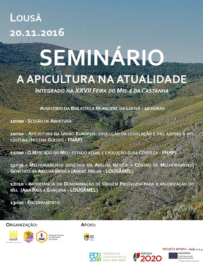 A pensar na valorização da fileira do mel, vai realizar-se no próximo dia 20 de Novembro, pelas 10h00, no Auditório da Biblioteca Municipal da Lousã, o seminário/debate subordinado ao tema “A Apicultura na Atualidade”. A organização é da Lousamel e da Federação Nacional dos Apicultores de Portugal, com a APINFO. O seminário terá como temas: A Apicultura na União Europeia; Evolução da Legislação e das Ajudas Á Apicultura, O mercado do Mel; Estado Actual e Evolução, O melhoramento genético da abelha e a Importância da denominação de origem protegida para a valorização do mel. O debate será conduzido por especialistas do sector. A participação é gratuita e a inscrição obrigatória através de lousamel@lousamel.pt.