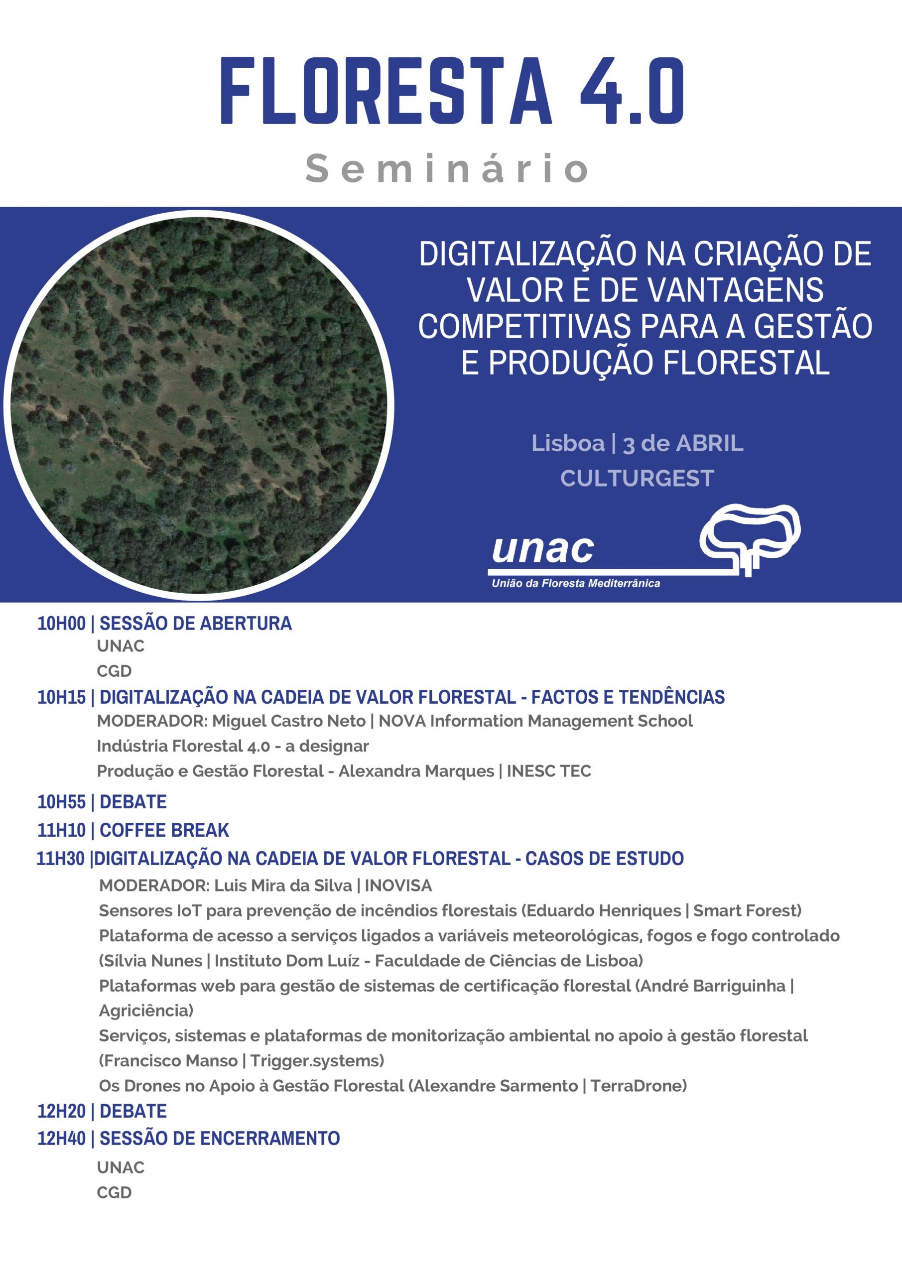 A UNAC – União da Floresta Mediterrânica vai realizar, no próximo dia 3 de Abril em Lisboa, na Culturgest o Seminário ” FLORESTA 4.0- DIGITALIZAÇÃO NA CRIAÇÃO DE VALOR E DE VANTAGENS COMPETITIVAS PARA A GESTÃO E PRODUÇÃO FLORESTAL “.
