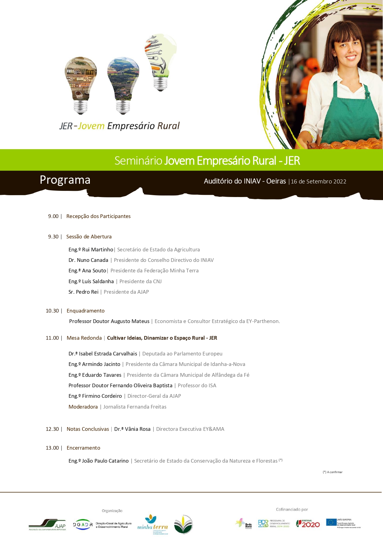 No próximo dia 16 de setembro, pelas 9 horas, no Auditório do Instituto Nacional de Investigação Agrária e Veterinária, em Oeiras, realiza-se o Seminário Final do projecto centrado na temática JER – Jovem Empresário Rural, promovido pela AJAP – Associação dos Jovens Agricultores de Portugal, em parceria com a DGADR – Direção-Geral de Agricultura e Desenvolvimento Rural, a Minha Terra – Federação Portuguesa de Associações de Desenvolvimento Local e a CNJ – Confederação Nacional dos Jovens Agricultores e do Desenvolvimento Rural.