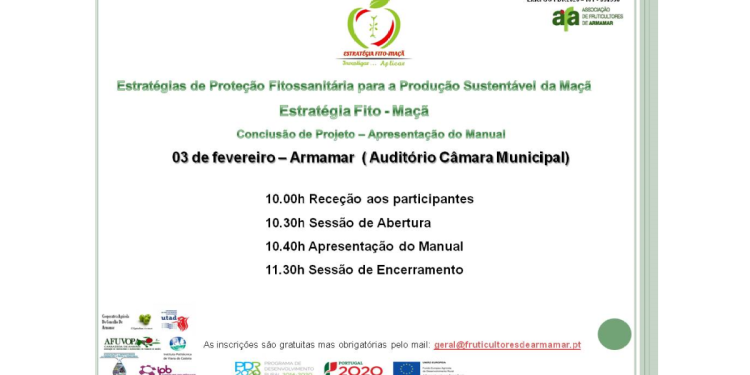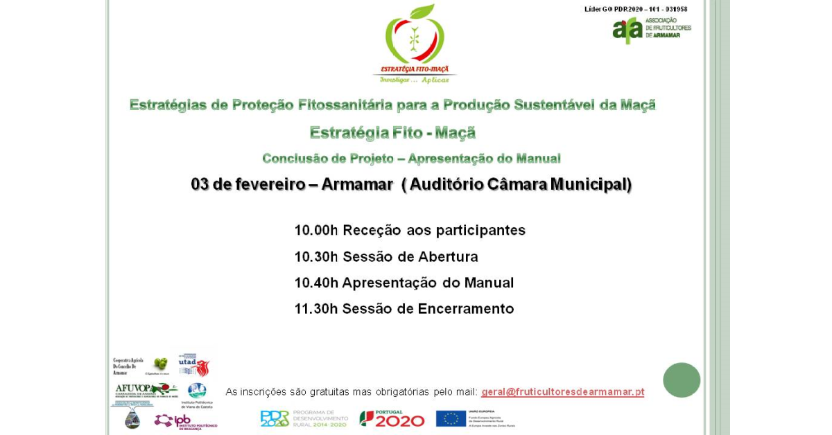 No próximo dia 3 de fevereiro de 2023, no auditório da Câmara Municipal de Armamar, terá lugar a sessão de encerramento do Grupo Operacional Fito-Maçã onde serão apresentadas as conclusões do projeto e o manual resultante do mesmo.