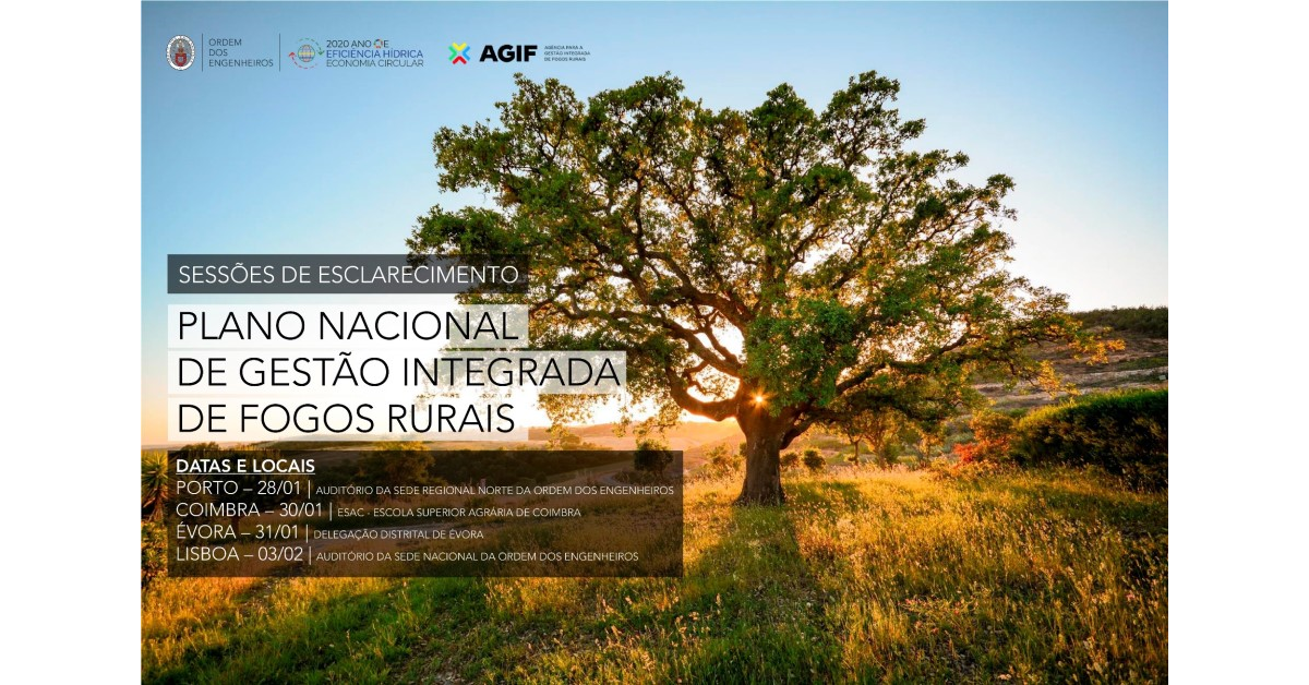 O Conselho Diretivo Nacional da Ordem dos Engenheiros (OE), através dos seus Conselhos Nacional e Regionais do Colégio de Engenharia Florestal, e a Agência para a Gestão Integrada de Fogos Rurais (AGIF) organizam um ciclo de sessões de esclarecimento sobre o Plano Nacional de Gestão Integrada de Fogos Rurais (PNGIFR), sendo que a sessão de Lisboa terá lugar no próximo dia 3 de fevereiro, pelas 17h15, na sede Nacional da OE.