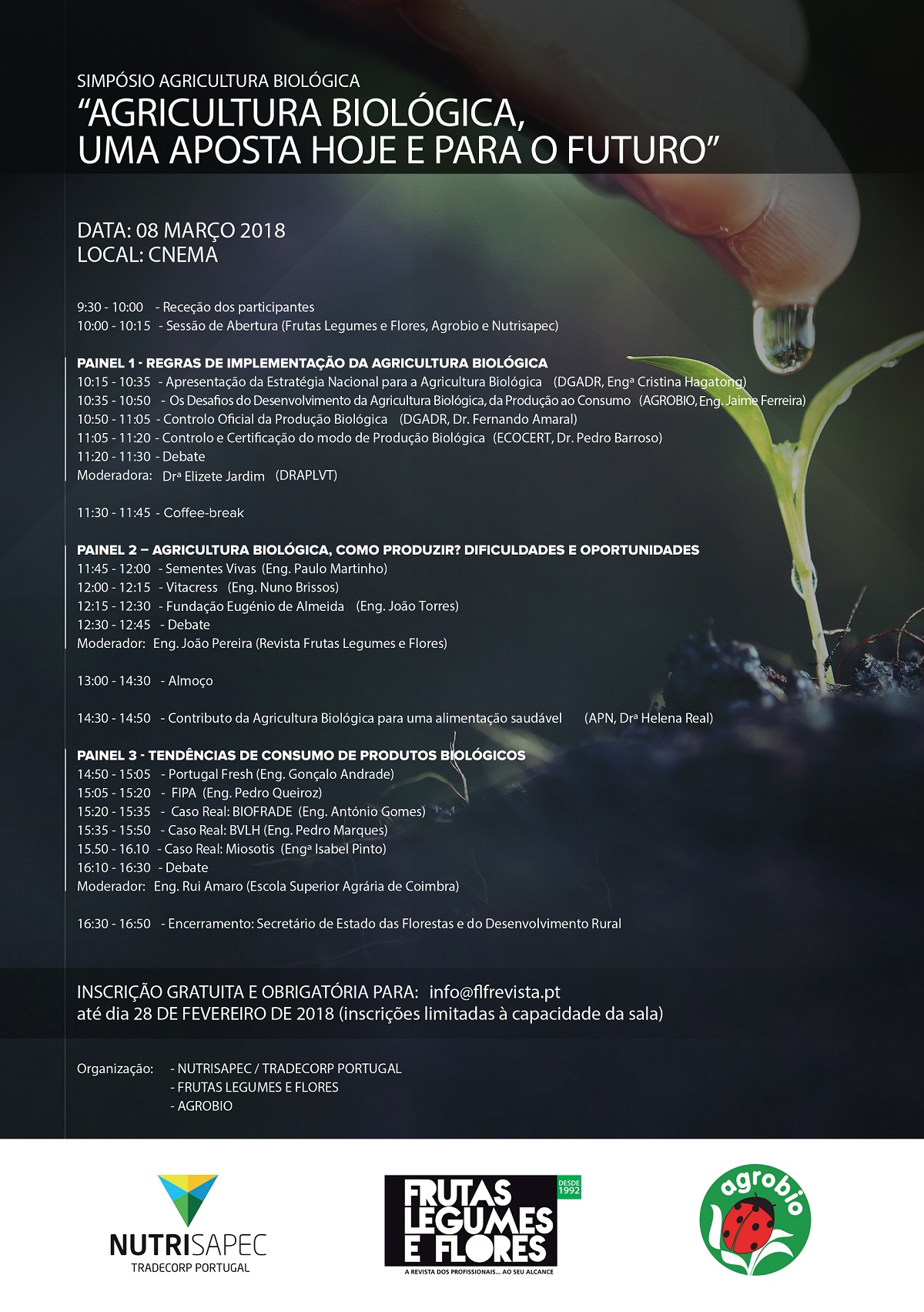 No próximo dia 8 de Março, vai realizar-se no CNEMA (Santarém), um Simpósio dedicado à Agricultura Biológica. Pretende-se que esta iniciativa, organizada pela NUTRISAPEC/TRADECORP PORTUGAL, em parceria com a REVISTA FRUTAS LEGUMES E FLORES e a Associação Portuguesa de Agricultura Biológica (AGROBIO), seja um fórum de esclarecimento, que dê voz aos principais desafios do setor, promova boas práticas e fortaleça as raízes da agricultura biológica em Portugal.