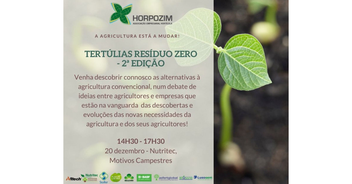 No dia 20 de Dezembro, as instalações da Horpozim – Associação Empresarial Hortícola, situadas em Póvoa de Varzim, acolhem mais um evento das “Tertúlias Resíduo Zero”, no âmbito da segunda edição desta iniciativa. As “Tertúlias Resíduo Zero” são organizadas pela Horpozim e incidem sobre «alternativas à agricultura convencional».
