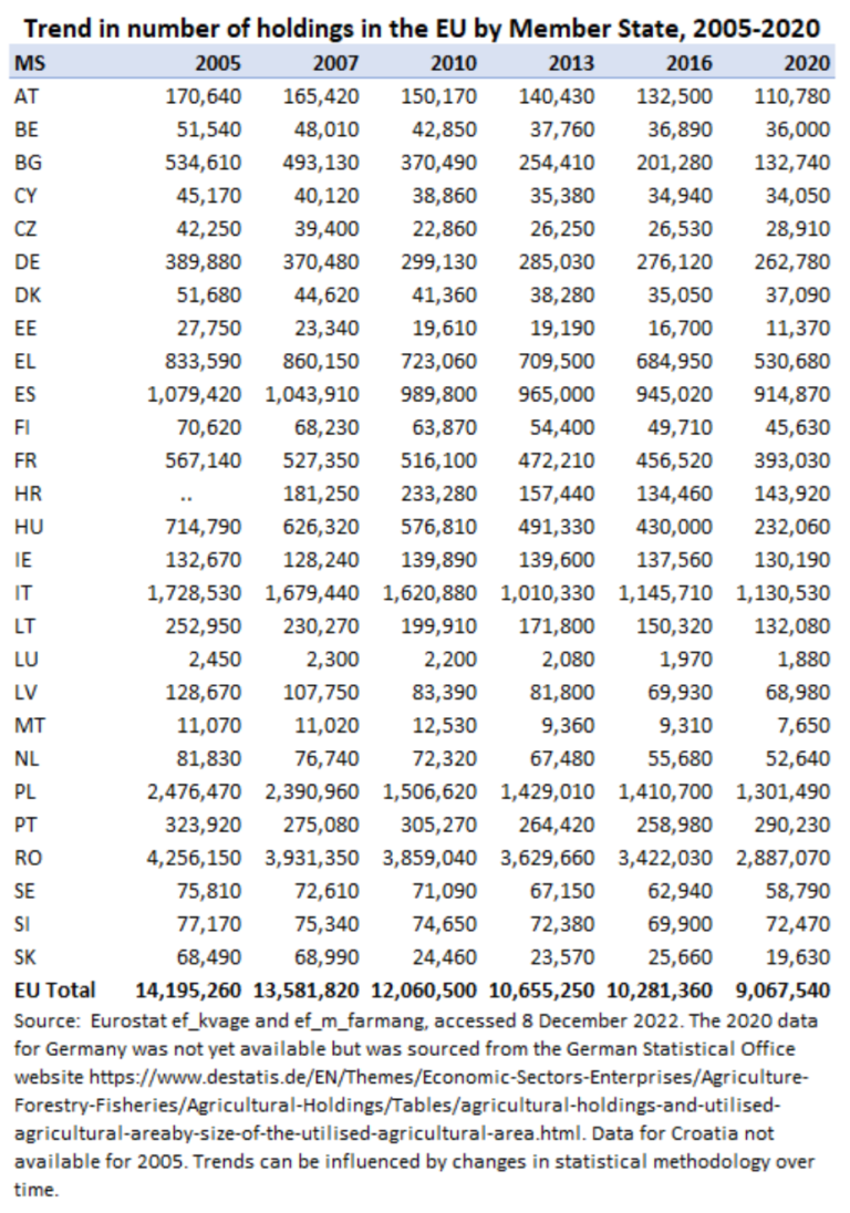 The Eurostat data now make it possible to track changes in the number of holdings over the 15 year period 2005 to 2020 for the EU27. As with any time series data, it is important to be aware of the potential for definitional changes to influence the trend in the series. The most critical issue is how the statistical population of agricultural holdings is defined, which is described in the metadata for the Eurostat farm structure (ef) domain. Particularly changes in the minimum size threshold to be deemed an agricultural holding can influence the trend.