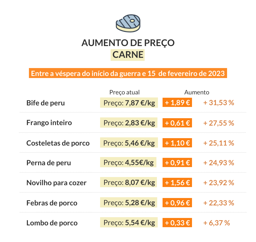 Comprar um cabaz com diferentes variedades de carne pode agora custar 39,60 euros, um aumento de 22,81% face há um ano. Na véspera do início da guerra na Ucrânia, os mesmos produtos custavam, em média, 32,25 euros.