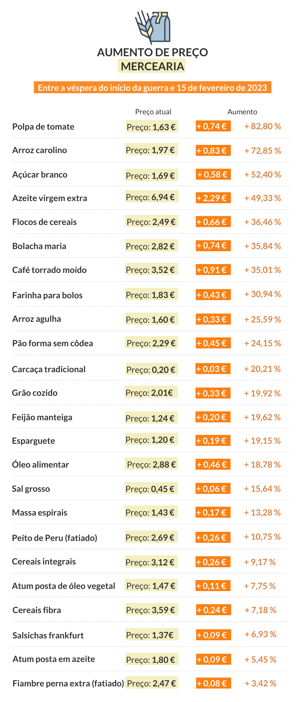 A polpa de tomate, o arroz carolino e o açúcar branco formam o pódio dos produtos da categoria cujo preço mais aumentou desde que a guerra começou. No caso da polpa de tomate a subida é de mais de 61%; no arroz carolino já chegou aos 59%; e no açúcar branco atingiu os 49 por cento.