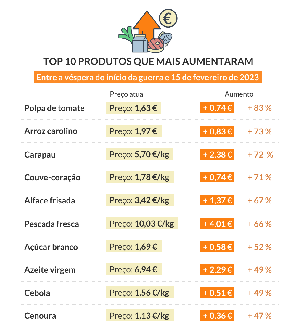 Ir ao talho e comprar carne custava, a 23 de fevereiro de 2022, 32,24 euros; uma seleção de alguns produtos congelados ficava em 13,85 euros; as frutas e legumes essenciais para uma família custavam 23,60 euros; os laticínios custavam 11,48 euros; as mercearias representavam uma despesa de 42,15 euros; e o peixe custava 60,31 euros. No entanto, no último ano, todos estes produtos ficaram mais caros.