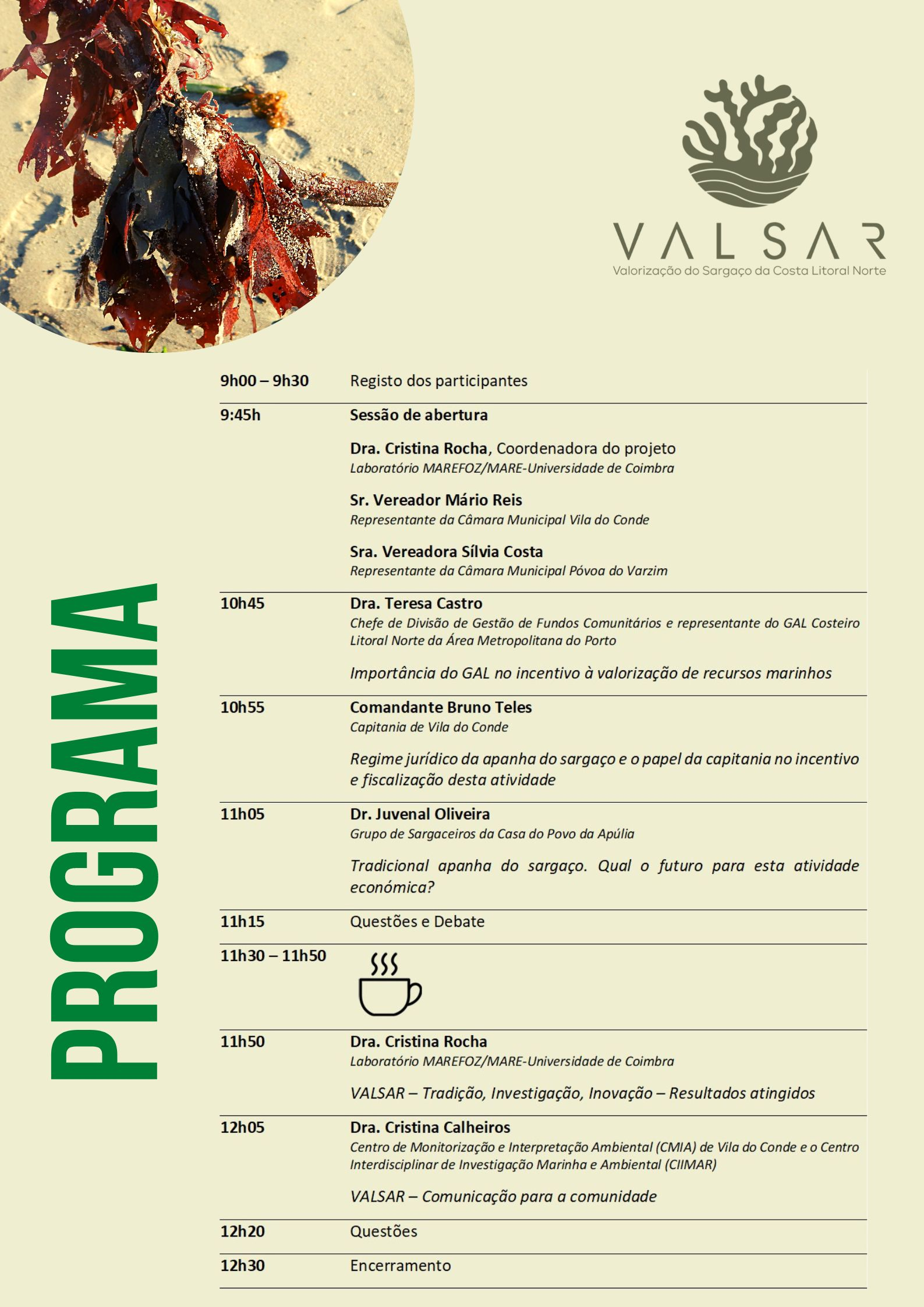 O Seminário “Valorização do Sargaço na Costa Litoral Norte” decorrerá no dia 30 de novembro de 2022 no âmbito do projeto VALSAR – Valorização do Sargaço na Costa Litoral Norte, financiado pelo Fundo Europeu de Assuntos Marítimos, das Pescas e da Aquicultura (FEAMPA) através do programa MAR2020.