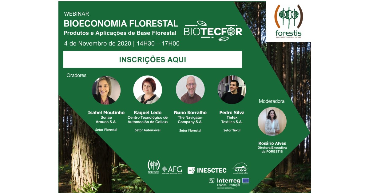 No dia 4 de Novembro, às 14h30, realiza-se o Webinar BIOECONOMIA FLORESTAL: Produtos e Aplicações de Base Florestal.