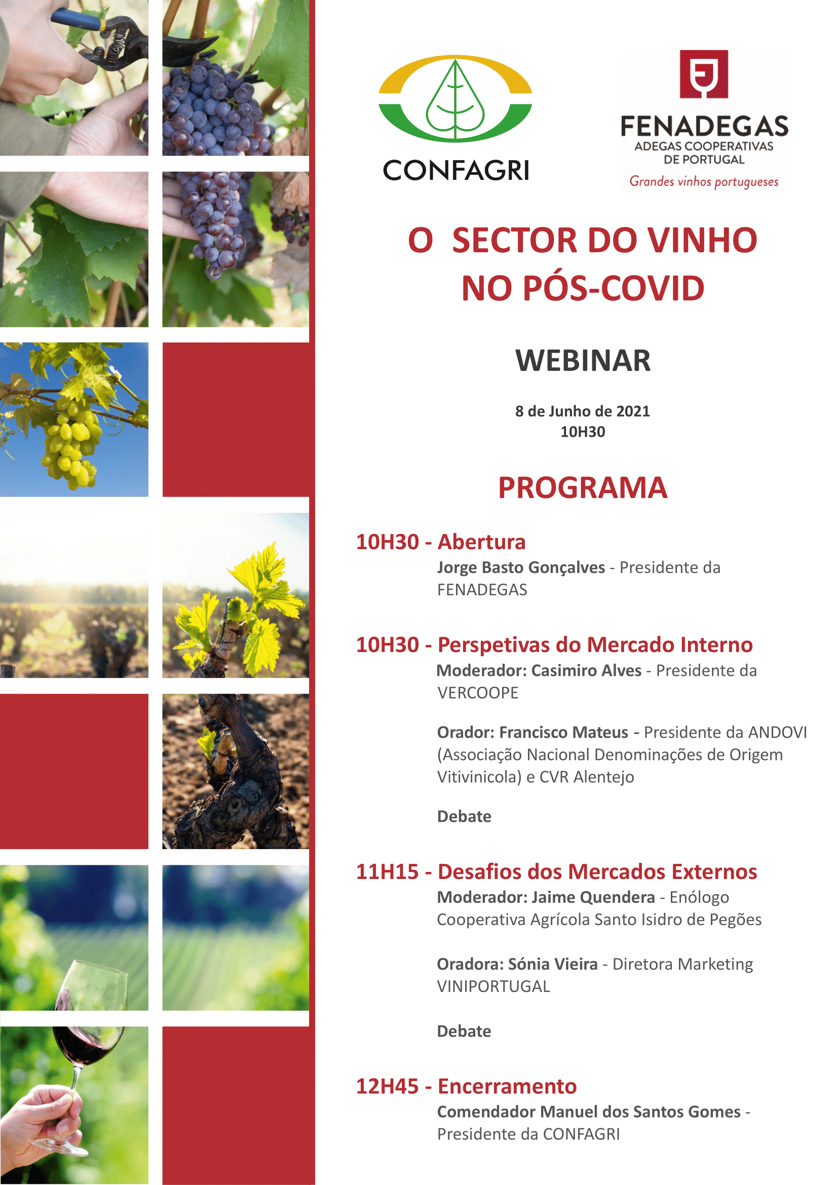 Preocupadas com este impacto, a CONFAGRI e FENADEGAS decidiram realizar este Webinar com responsáveis do setor no mercado nacional e internacional, assim como responsáveis de vendas de duas adegas cooperativas associadas, para uma análise do mercado e sua evolução, cuja inscrição é gratuita mas com número limitado de participantes, pelo que para assistir a este evento deverá inscrever-se e ser-lhe-á enviado o respetivo link de acesso.
