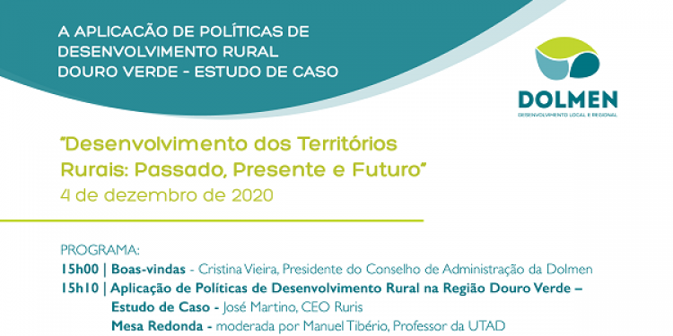 A Dolmen promove, no próximo dia 4 de dezembro, o webinar “Desenvolvimento dos Territórios Rurais: Passado, Presente e Futuro”, no âmbito do qual serão apresentados os resultados preliminares do estudo que tem sido desenvolvido no âmbito do projeto “A aplicação de Políticas de Desenvolvimento Rural na Região do Douro Verde – Estudo de Caso”, que tem como objetivo avaliar o impacto da aplicação de políticas de desenvolvimento rural no território Douro Verde, nos setores agroalimentar, floresta, agricultura e dinamização das zonas rurais/abordagem LEADER.