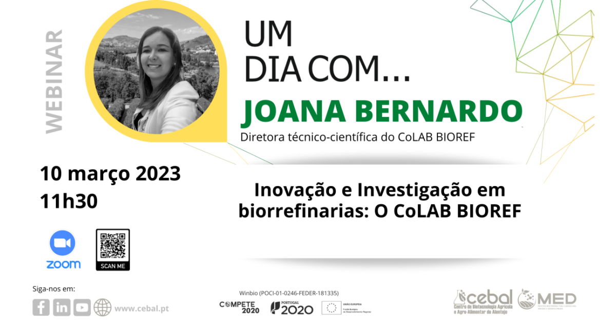 O CEBAL organiza no próximo dia 10 de março às 11:30, mais uma sessão da iniciativa “UM DIA COM…” em formato de webinar através da plataforma zoom, tendo como convidada Joana Bernardo, Diretora técnico-científica do CoLAB BIOREF, que irá apresentar a palestra intitulada: “Inovação e Investigação em biorrefinarias: O CoLAB BIOREF”.