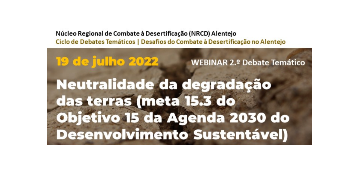 No âmbito do Ciclo de Debates Temáticos | Desafios do Combate à desertificação no Alentejo, realiza-se no próximo dia 19 de julho o webinar: “Neutralidade da degradação das terras”.
