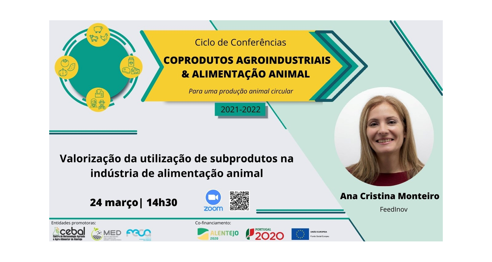 Na próxima quinta-feira, dia 24 de março, pelas 14h30, realiza-se a sessão online , com a Ana Cristina Monteiro, Gestora de Ciência no FeedInov Colab, no âmbito do Ciclo de Conferências “Coprodutos Agroindustriais & Alimentação Animal – Para uma produção animal circular”, organizado pelo Centro de Biotecnologia Agrícola e Agroalimentar do Alentejo (CEBAL). A sessão abordará a valorização de subprodutos pela indústria de alimentos compostos, para que no futuro venham a ser utilizados de forma mais transversal na alimentação animal.