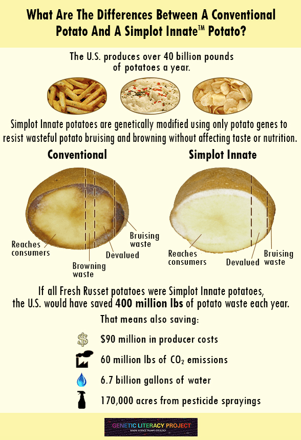 About 2.9 trillion pounds of food is lost per year. Let’s consider the “Non-GM, Conventional Potato”. Browning and bruising are common issues that lead to crop spoilage. They also affect its taste. Farmers discard these crops as they know supermarkets and other buyers won’t accept damaged crops. Other fruits and vegetables including apples and mushrooms go into waste because of their browning properties and not looking beautiful aesthetically.