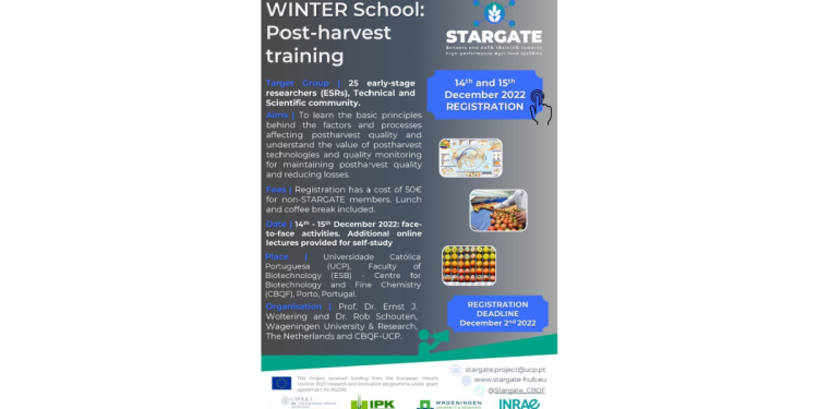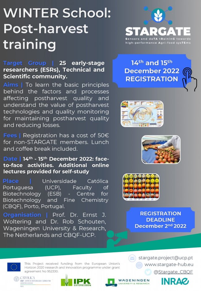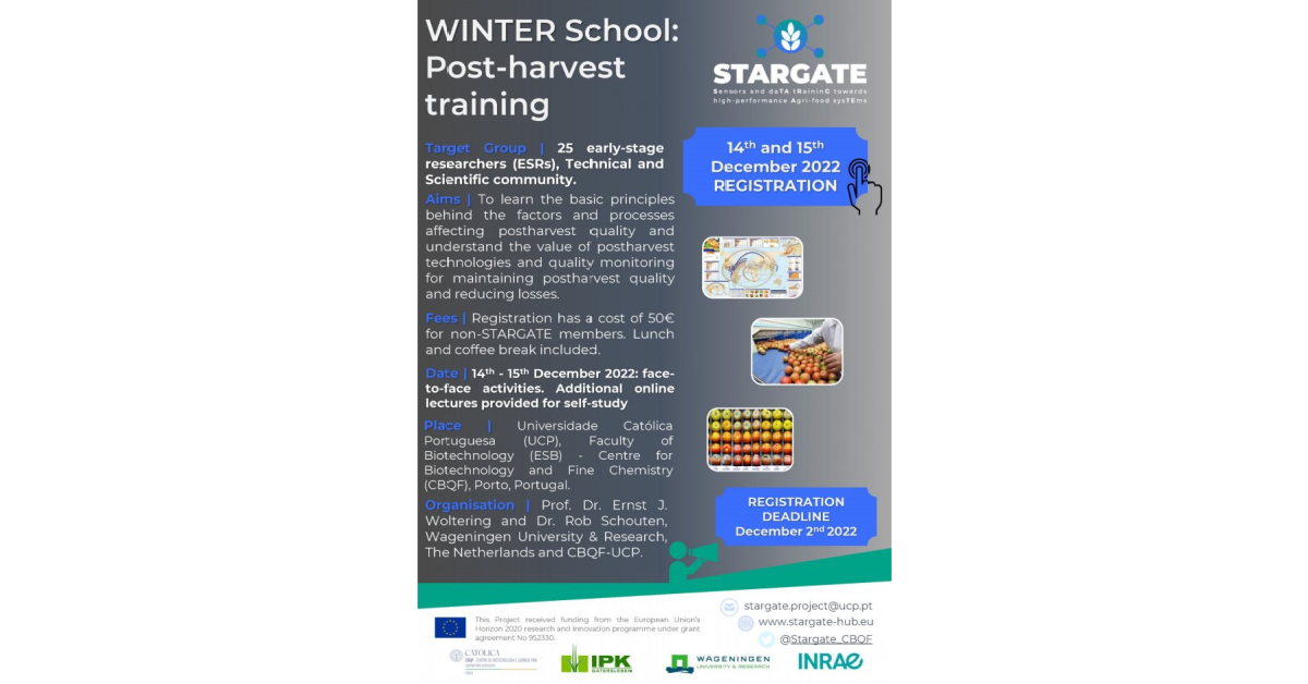 The STARGATE project, through the partners Universidade Católica Portuguesa (UCP) and the Wageningen University & Research (WR), is organising a WINTER School entitled ‘Post-harvest training’ on the 14th and 15th of December 2022. The Winter School will be held at the building of the School of Biotechnology (ESB) / Centre for Biotechnology and Fine Chemistry (CBQF), Porto, Portugal.