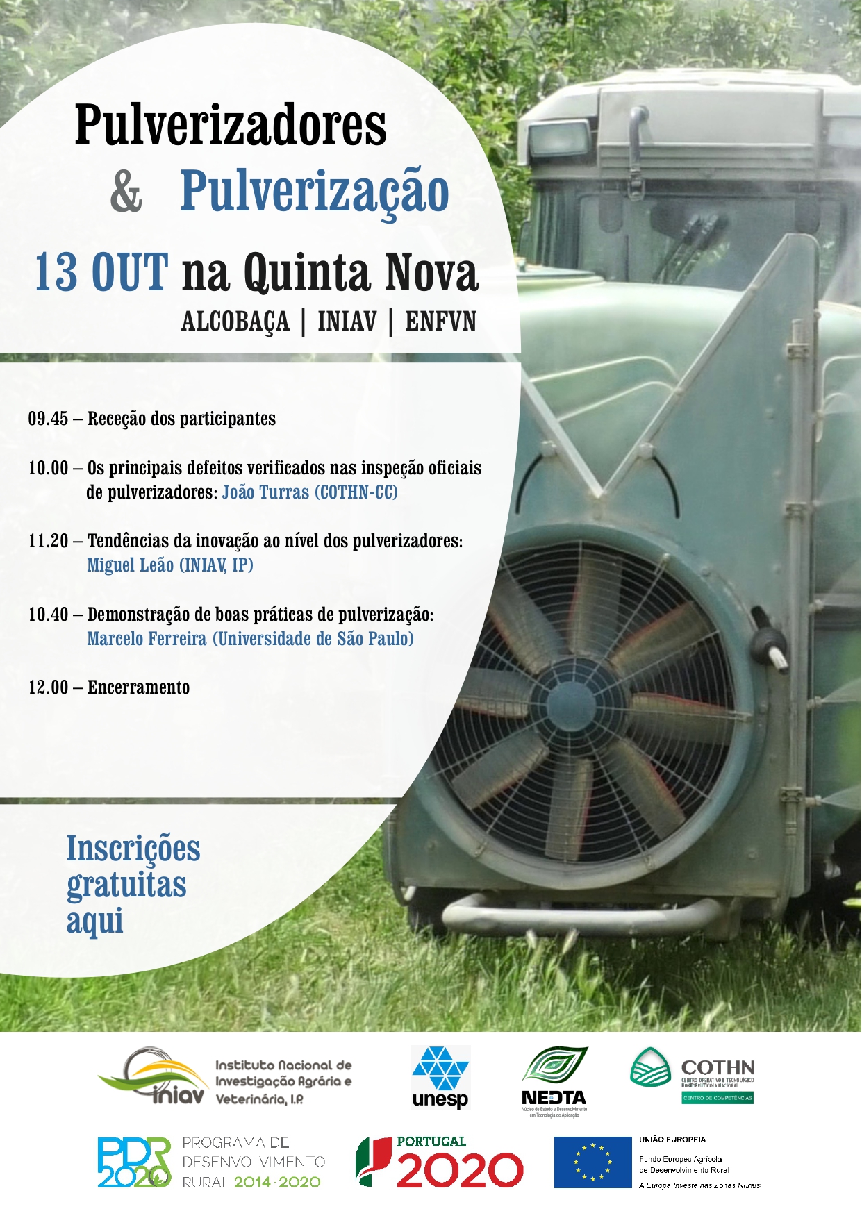 Vai ter lugar no pomar da Quinta Nova, em Alcobaça, no próximo dia 13 de outubro, o Workshop Pulverizadores e Pulverização, com o apoio do INIAV e a Universidade de São Paulo.