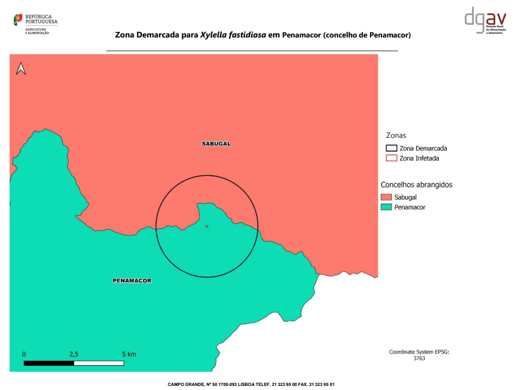 - Procede-se à delimitação da zona demarcada para Xylella fastidiosa, encontrando-se em anexo o respetivo mapa, bem como a lista das freguesias total ou parcialmente abrangidas por esta zona demarcada, também disponível na página eletrónica da DGAV1;